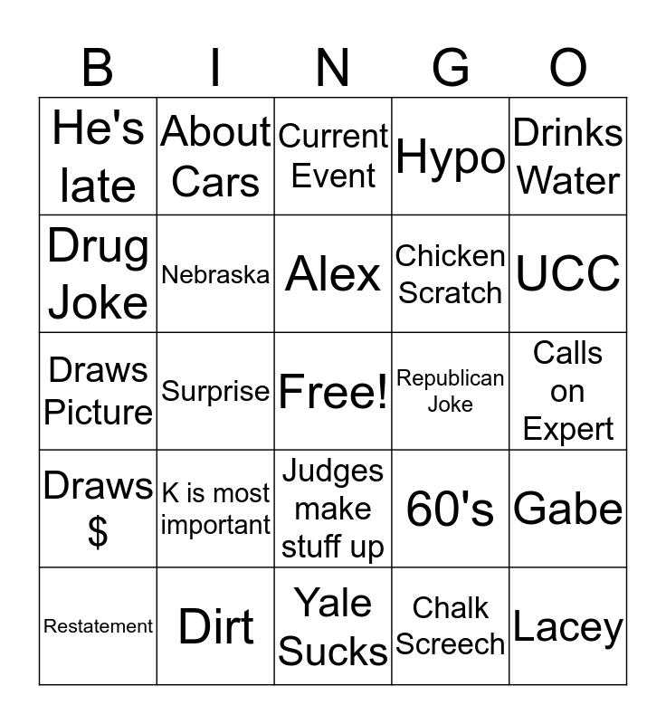 This bingo card has a free space and 37 words: Satan, Jerk, Movie Reference, Nebraska, Gabe, K is most important, Alex, Checks Window, Drinks Water, Joke California, Surprise, Hypo, Lacey, Calls on Expert, Drug Joke, Draws $, Its Like..., Current Event, Judges make stuff up, Republican Joke, He's late, UCC, Restatement, Yale Sucks, Class Ends Late, Chalk Screech, About Cars, Party is idiot, Name Drops Judge, I'm Rich, Shot at other Professor, Dirt, Draws Picture, Throws Somthing, 60's, Chicken Scratch and Cardoza.