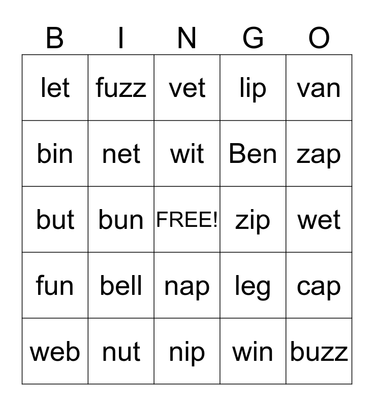 This bingo card has a free space and 24 words: bell, nut, wit, web, van, let, bin, fuzz, zip, nap, Ben, but, leg, cap, net, win, wet, vet, zap, bun, buzz, fun, lip and nip.