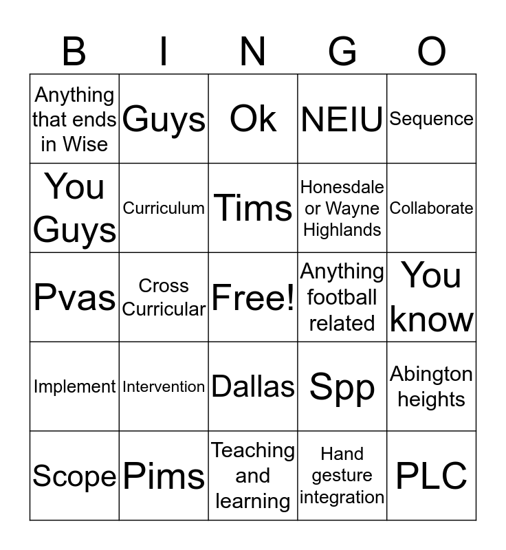 This bingo card has a free space and 24 words: Intervention, Pims, Tims, Scope, Sequence, Anything that ends in Wise, You Guys, Guys, Anything football related, Dallas, Honesdale or Wayne Highlands, Pvas, Spp, Abington heights, Curriculum, Hand gesture integration, You know, Ok, Collaborate, Cross Curricular, PLC, Implement, NEIU and Teaching and learning.
