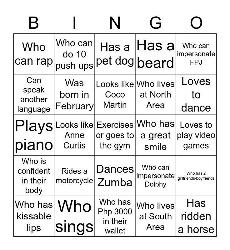 This bingo card has a free space and 24 words: Rides a motorcycle, Who sings, Looks like Coco Martin, Who has kissable lips, Who can impersonate FPJ, Who can rap, Can speak another language, Who can do 10 push ups, Who has a great smile, Dances Zumba, Who lives at North Area, Plays piano, Who can impersonate Dolphy, Who has 2 girlfriends/boyfriends, Was born in February, Who lives at South Area, Loves to play video games, Has a pet dog, Loves to dance, Looks like Anne Curtis, Has ridden a horse, Who is confident in their body, Has a beard and Who has Php 3000 in their wallet.
