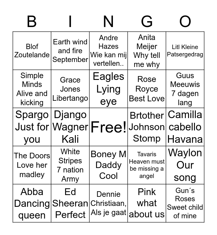 This bingo card has a free space and 24 words: White Stripes 7 nation Army, Ed Sheeran Perfect, Eagles Lying eye, Abba Dancing queen, Litl Kleine Patsergedrag, Blof Zoutelande, Simple Minds Alive and kicking, Earth wind and fire September, Brtother Johnson Stomp, Boney M Daddy Cool, Rose Royce Best Love, Spargo Just for you, Tavaris Heaven must be missing a angel, Waylon Our song, Grace Jones Libertango, Pink what about us, Camilla cabello Havana, Andre Hazes Wie kan mij vertellen.., Guus Meeuwis 7 dagen lang, Django Wagner Kali, Gun´s Roses Sweet child of mine, The Doors Love her madley, Anita Meijer Why tell me why and Dennie Christiaan, Als je gaat.