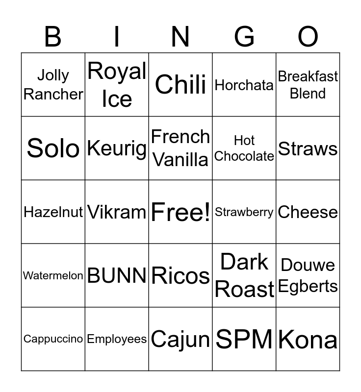 This bingo card has a free space and 24 words: BUNN, Employees, French Vanilla, Cappuccino, Breakfast Blend, Jolly Rancher, Solo, Royal Ice, Strawberry, Ricos, Hot Chocolate, Hazelnut, Dark Roast, Douwe Egberts, Keurig, SPM, Cheese, Chili, Straws, Vikram, Kona, Watermelon, Horchata and Cajun.