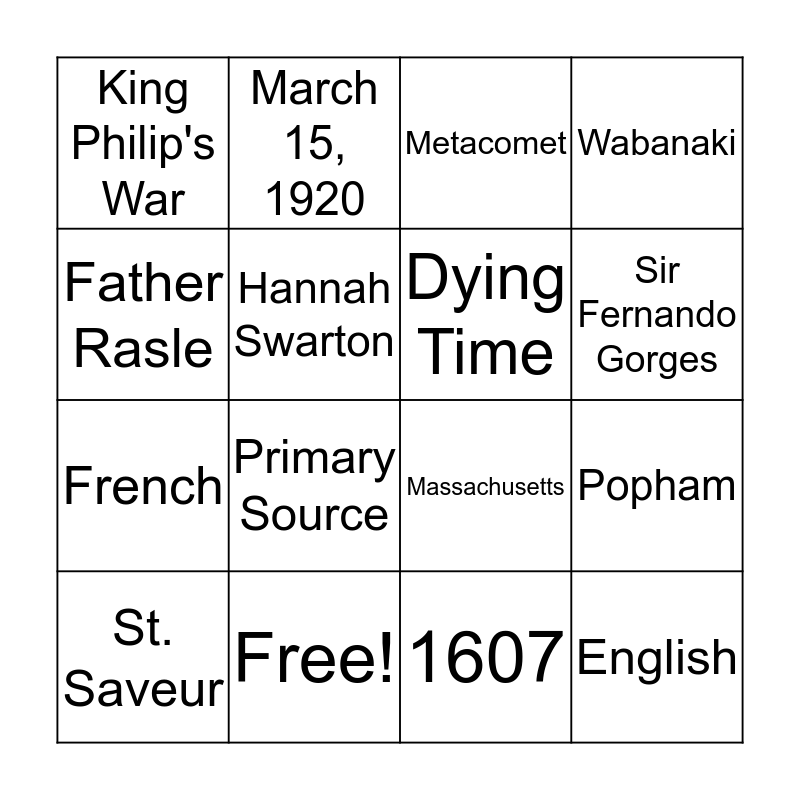 This bingo card has 16 words: Free!, Popham, Metacomet, King Philip's War, French, March 15, 1920, Massachusetts, 1607, Father Rasle, Hannah Swarton, St. Saveur, Wabanaki, Primary Source, Sir Fernando Gorges, Dying Time and English.
