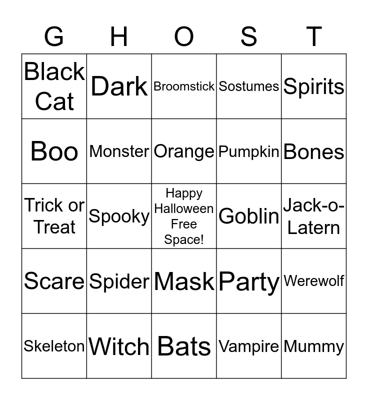 This bingo card has a free space and 24 words: Spider, Witch, Orange, Skeleton, Spirits, Black Cat, Boo, Dark, Goblin, Mask, Pumpkin, Trick or Treat, Party, Werewolf, Monster, Vampire, Jack-o-Latern, Broomstick, Bones, Spooky, Mummy, Scare, Sostumes and Bats.