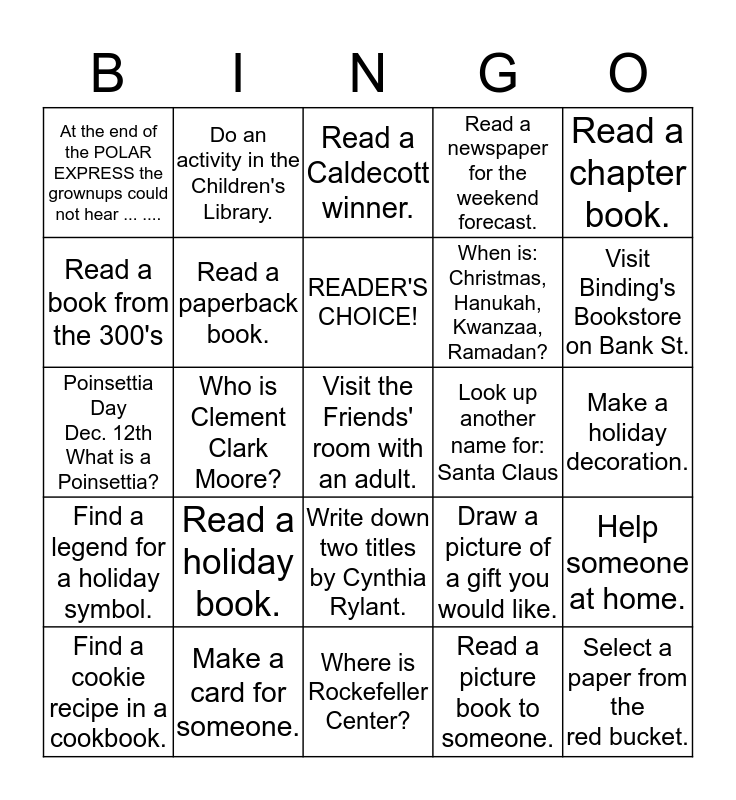 This bingo card has a free space and 24 words: Read a holiday book., Make a card for someone., READER'S CHOICE!, Find a cookie recipe in a cookbook., Read a chapter book., At the end of the POLAR EXPRESS the grownups could not hear ... ...., Read a book from the 300's, Do an activity in the Children's Library., Look up another name for: Santa Claus, Write down two titles by Cynthia Rylant., When is: Christmas, Hanukah, Kwanzaa, Ramadan?, Poinsettia Day Dec. 12th What is a Poinsettia?, Draw a picture of a gift you would like., Help someone at home., Read a paperback book., Read a picture book to someone., Make a holiday decoration., Read a Caldecott winner., Visit Binding's Bookstore on Bank St., Who is Clement Clark Moore?, Select a paper from the red bucket., Find a legend for a holiday symbol., Read a newspaper for the weekend forecast. and Where is Rockefeller Center?.
