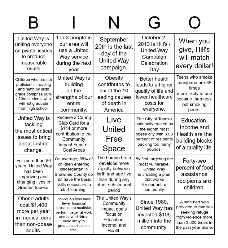 This bingo card has a free space and 24 words: On average, 55% of children entering kindergarten in Shawnee County do not have the basic skills necessary to start learning., Individuals who have fewer financial stresses are healthier, perform better at work and have children more likely to graduate school on time., Obesity contributes to six of the 10 leading causes of death in America, Obese adults cost $1,400 more per year in medical care than non-obese adults., When you give, Hill's will match every dollar!, United Way is uniting everyone on pivotal issues to produce measurable results., Children who are not proficient in reading and math by sixth grade comprise 60% of the students who will not graduate from high school., 1 in 3 people in our area will use a United Way service during the next year, The City of Topeka nationally ranked as the eighth most obese city with 33.3 percent of residents packing too many pounds., The human brain develops more rapidly between birth and age five than during any other subsequent period, Better health leads to a higher quality of life and lower healthcare costs for everyone., United Way is tackling the most critical issues to bring about lasting change., By first targeting the most vulnerable, United Way is creating a plan that works for our entire community., Forty-two percent of food assistance recipients are children., United Way is building on the strengths of our entire community., Since 1980, United Way has invested $105 million into the community., Education, Income and Health are the building blocks of a quality life., September 20th is the last day of the United Way campaign., Teens who smoke marijuana are 85 times more likely to use cocaine than non-pot smoking peers., Receive a Caring Club Card for a $144 or more contribution to the Community Impact Fund or Goal Areas, A safe bed was provided to families seeking refuge from violence more than 3,800 times in the past year alone., For more than 80 years, United Way has been improving and changing lives in Greater Topeka., October 2, 2013 is Hill's / United Way Campaign Celebration Day and The United Way’s Community Impact goals focus on Education, Income, and Health.