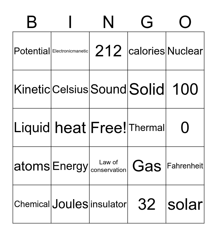 This bingo card has a free space and 24 words: Energy, Joules, Sound, Chemical, Nuclear, Potential, Kinetic, Electronicmanetic, Thermal, Law of conservation, Solid, Liquid, Gas, Fahrenheit, Celsius, 32, 0, 212, 100, heat, solar, atoms, calories and insulator.