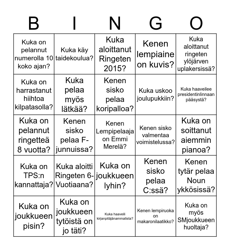 This bingo card has a free space and 24 words: Kuka aloitti Ringeten 6-Vuotiaana?, Kuka on joukkueen tytöistä on jo täti?, Kenen sisko pelaa koripalloa?, Kuka on joukkueen pisin?, Kuka aloittanut ringeten ylöjärven uplakersissä?, Kuka on pelannut numerolla 10 koko ajan?, Kuka on harrastanut hiihtoa kilpatasolla?, Kuka käy taidekoulua?, Kenen sisko valmentaa voimistelussa?, Kuka on joukkueen lyhin?, Kuka uskoo joulupukkiin?, Kuka on pelannut ringetteä 8 vuotta?, Kenen sisko pelaa C:ssä?, Kenen tytär pelaa Noun ykkösissä?, Kuka pelaa myös lätkää?, Kenen lempiruoka on makaronilaatikko?, Kuka on soittanut aiemmin pianoa?, Kuka aloittanut Ringeten 2015?, Kuka haaveilee presidentinlinnaan pääsystä?, Kenen sisko pelaa F-junnuissa?, Kuka on myös SMjoukkueen huoltaja?, Kuka on TPS:n kannattaja?, Kenen lempiaine on kuvis? and Kuka haaveili kirjanpitäjänammatista?.