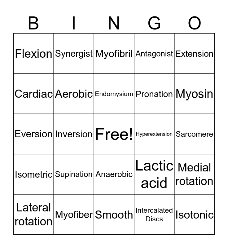 This bingo card has a free space and 35 words: Abduction, Actin, Adduction, Aerobic, Anaerobic, Antagonist, Cardiac, Circumduction, Endomysium, Epimysium, Eversion, Extension, Fascicle, Fixator, Flexion, Hyperextension, Intercalated Discs, Inversion, Isometric, Isotonic, Lactic acid, Lateral rotation, Medial rotation, Myofiber, Myofibril, Myosin, Perimysium, Prime mover, Pronation, Sarcomere, Skeletal, Smooth, Supination, Synergist and Z-line.