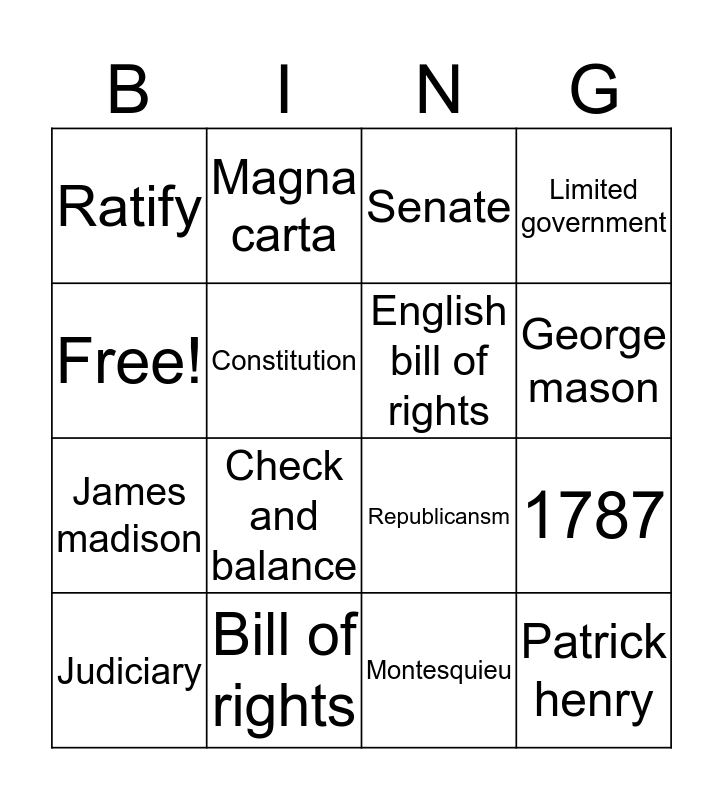 This bingo card has 16 words: Bill of rights, 1787, Senate, Ratify, James madison, Magna carta, Republicansm, Montesquieu, Free!, Constitution, Judiciary, Limited government, Check and balance, George mason, English bill of rights and Patrick henry.