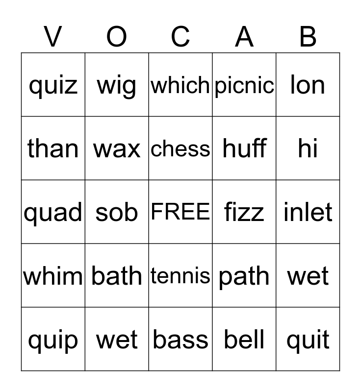 This bingo card has a free space and 24 words: bath, wet, chess, quip, lon, quiz, than, wig, fizz, tennis, huff, quad, path, wet, wax, bell, inlet, which, hi, sob, quit, whim, picnic and bass.
