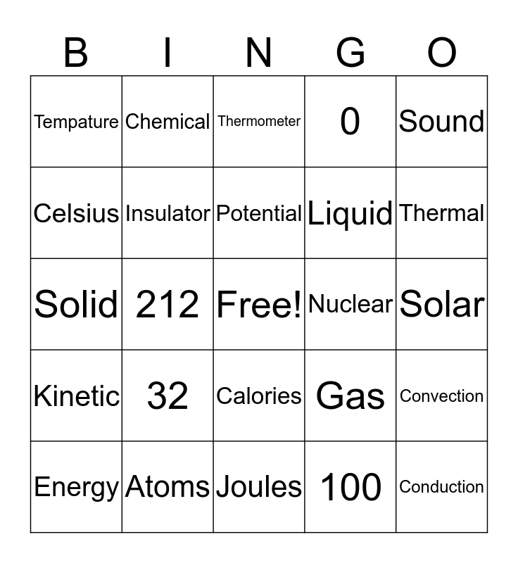 This bingo card has a free space and 24 words: Energy, 32, Potential, 100, Sound, Tempature, Chemical, Thermometer, Nuclear, Solar, Solid, Insulator, Gas, Convection, Celsius, Atoms, Joules, 0, Thermal, Kinetic, 212, Calories, Liquid and Conduction.