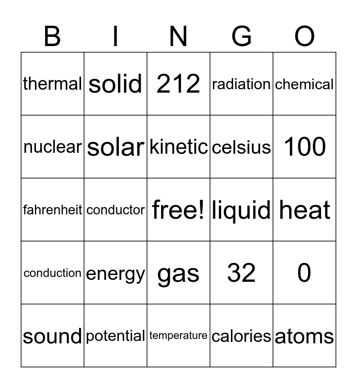 This bingo card has a free space and 24 words: energy, potential, kinetic, sound, chemical, thermal, nuclear, solid, liquid, gas, celsius, fahrenheit, 32, 0, solar, calories, heat, 212, 100, conductor, atoms, conduction, radiation and temperature.