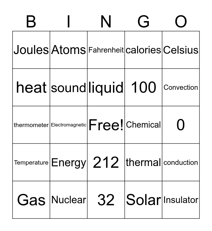 This bingo card has a free space and 24 words: Energy, Nuclear, liquid, Gas, Celsius, Joules, heat, Atoms, Chemical, 212, 100, thermometer, thermal, conduction, sound, Solar, 0, Fahrenheit, Convection, Electromagnetic, Insulator, Temperature, calories and 32.