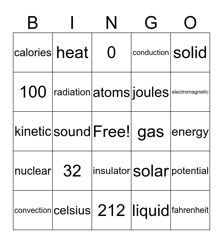 This bingo card has a free space and 24 words: 32, celsius, atoms, convection, solid, calories, 100, heat, gas, insulator, joules, kinetic, solar, potential, radiation, liquid, energy, 0, electromagnetic, sound, fahrenheit, nuclear, conduction and 212.
