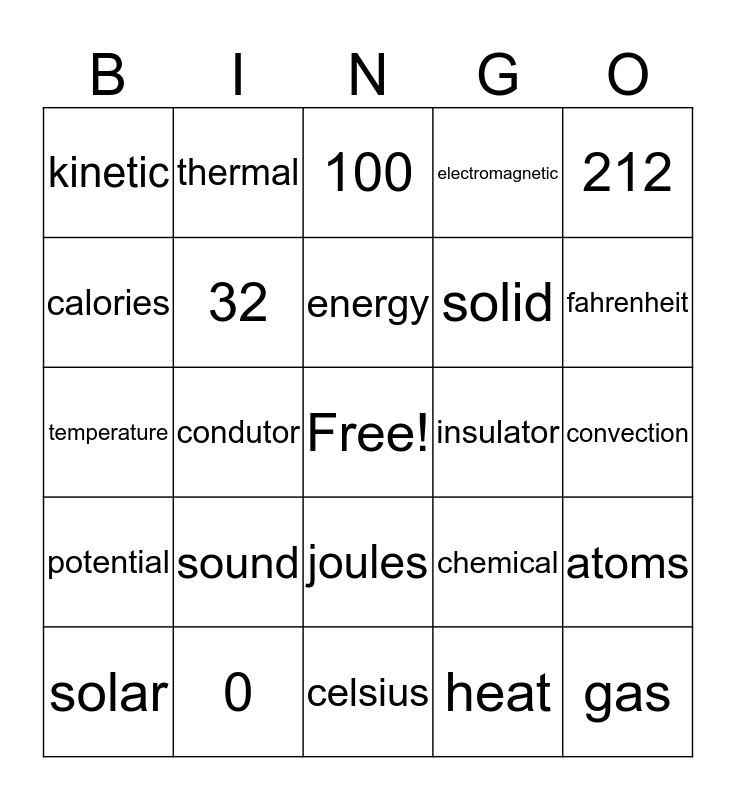 This bingo card has a free space and 24 words: sound, 0, energy, solar, 212, kinetic, calories, thermal, insulator, joules, solid, temperature, chemical, atoms, 32, heat, convection, 100, fahrenheit, condutor, gas, potential, electromagnetic and celsius.