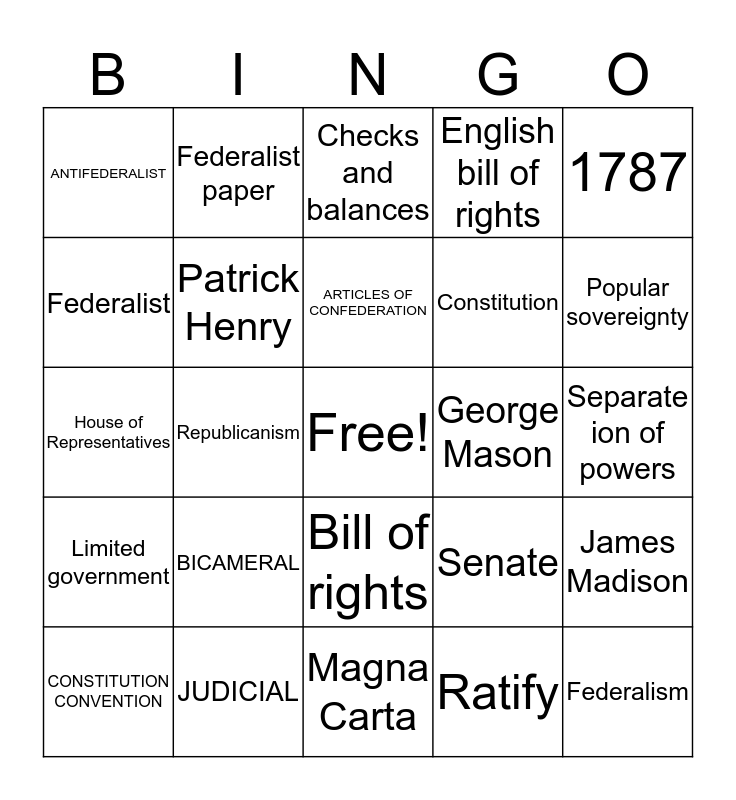 This bingo card has a free space and 24 words: BICAMERAL, JUDICIAL, ARTICLES OF CONFEDERATION, CONSTITUTION CONVENTION, 1787, ANTIFEDERALIST, Federalist, Federalist paper, George Mason, Bill of rights, Constitution, House of Representatives, Senate, James Madison, Patrick Henry, Ratify, Separate ion of powers, Checks and balances, Popular sovereignty, Republicanism, Federalism, Limited government, English bill of rights and Magna Carta.