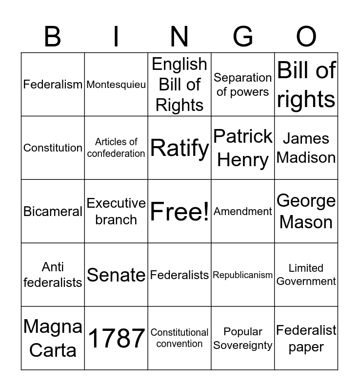 This bingo card has a free space and 24 words: Senate, 1787, Ratify, Magna Carta, Bill of rights, Federalism, Constitution, Montesquieu, Amendment, Federalists, Patrick Henry, Bicameral, Republicanism, Limited Government, Articles of confederation, Popular Sovereignty, George Mason, English Bill of Rights, James Madison, Executive branch, Federalist paper, Anti federalists, Separation of powers and Constitutional convention.