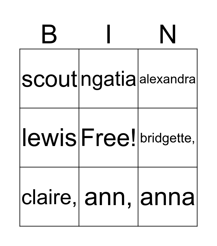 This bingo card has a free space and 43 words: annabelle, josh, milla, eve, raph, tom, alexandra, koa, anna, taha, lewis, carla, aila, luqmaan, arsh, ari, chanel, am, bessie, isabel, ngatia, max, scarlet, scout, oliver, alice, hannah, becc, deb, chris, nici, jess, faith, michael, ben, lori, kate,, ann,, bridgette,, linda,, jessie,, claire, and tim.