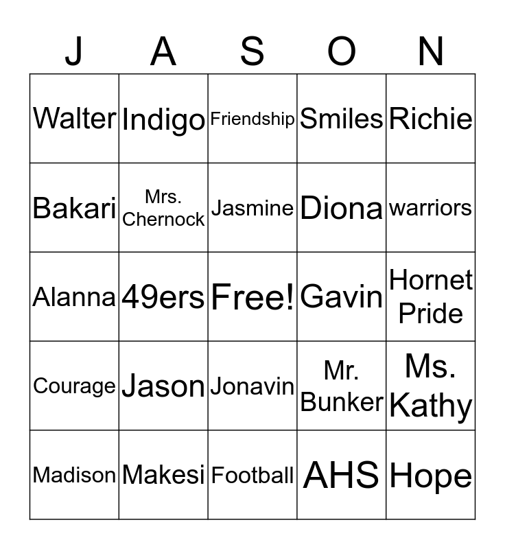 This bingo card has a free space and 24 words: Jason, Makesi, Jasmine, Madison, Richie, Walter, Bakari, Indigo, Gavin, Jonavin, Diona, Alanna, Mr. Bunker, Ms. Kathy, Mrs. Chernock, AHS, Hornet Pride, Friendship, warriors, 49ers, Hope, Courage, Smiles and Football.