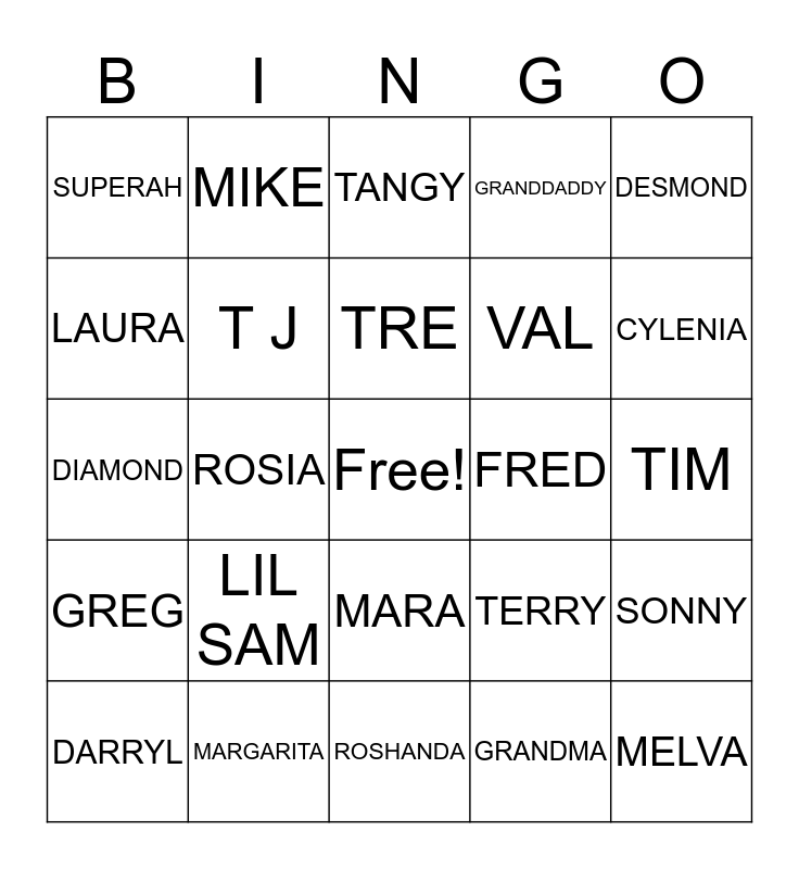 This bingo card has a free space and 43 words: WYLENIA, ROSIA, ROBERT, GRANDMA, UNCLE WILLIAM, DARRYL, T J, SUSIE, GRANDDADDY, ANDRE, SUPERAH, LIL SAM, TERRY, SONNY, JEAN, BUDDY, DOLL, FRED, SYLVIA, DIAMOND, MIKE, TARA, SERINA, DESMOND, R J, MARGARITA, MARA, KEVIN, MELVA, GREG, ED, TRE, LEANDREW, TIM, LIL TERRY, SEDRIC, ROSHANDA, VAL, CYLENIA, LAURA, SAM, TANGY and KENNEDY.