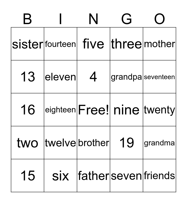 This bingo card has a free space and 24 words: twelve, six, 4, 15, mother, sister, 13, fourteen, nine, brother, grandpa, 16, 19, grandma, eleven, seven, twenty, five, seventeen, eighteen, friends, two, three and father.
