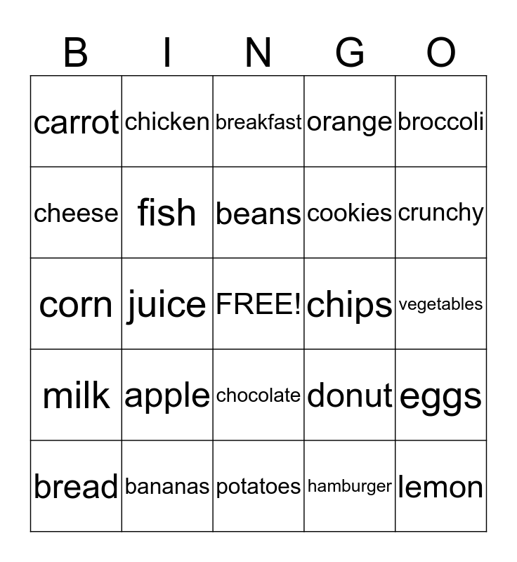 This bingo card has a free space and 24 words: apple, bananas, beans, bread, broccoli, carrot, cheese, chicken, chips, chocolate, cookies, corn, donut, eggs, fish, hamburger, vegetables, breakfast, crunchy, juice, lemon, milk, orange and potatoes.