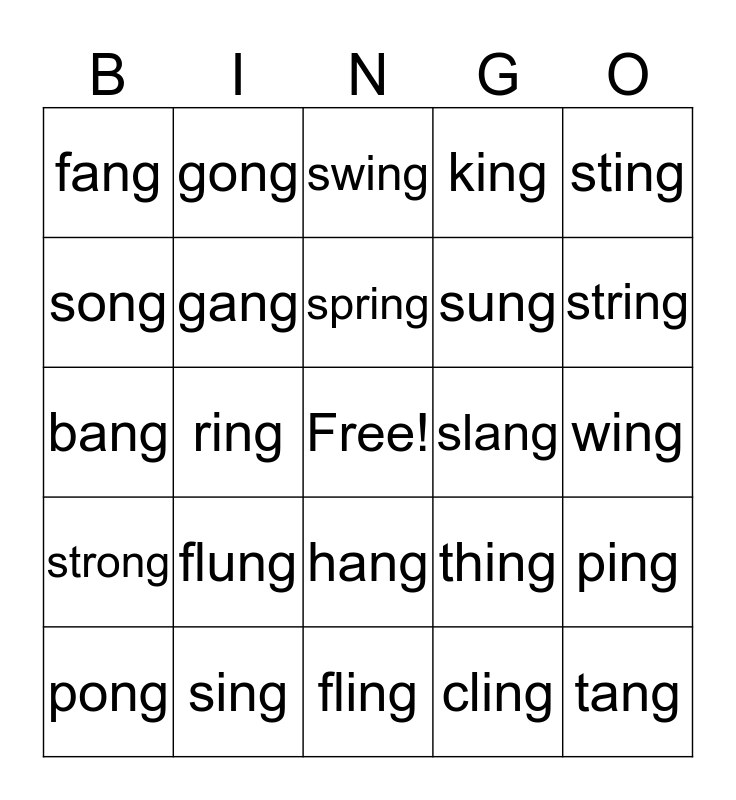 This bingo card has a free space and 25 words: flung, fling, spring, pong, sting, fang, song, gong, slang, hang, sung, bang, thing, ping, gang, long, wing, swing, string, ring, tang, sing, strong, king and cling.