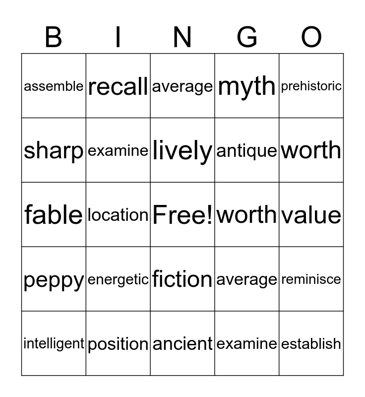 This bingo card has a free space and 24 words: energetic, position, lively, intelligent, prehistoric, assemble, sharp, recall, worth, fiction, antique, fable, average, reminisce, examine, examine, value, average, worth, location, establish, peppy, myth and ancient.