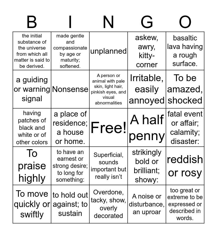 This bingo card has a free space and 24 words: To move quickly or swiftly, to have an earnest or strong desire; to long for something:, A person or animal with pale skin, light hair, pinkish eyes, and visual abnormalities, A noise or disturbance, an uproar, basaltic lava having a rough surface., the initial substance of the universe from which all matter is said to be derived., made gentle and compassionate by age or maturity; softened., unplanned, A half penny, fatal event or affair; calamity; disaster:, having patches of black and white or of other colors, Nonsense, strikingly bold or brilliant; showy:, reddish or rosy, a guiding or warning signal, to hold out against; to sustain, Overdone, tacky, show, overly decorated, askew, awry, kitty-corner, To be amazed, shocked, To praise highly, a place of residence; a house or home., Superficial, sounds important but really isn’t, Irritable, easily annoyed and too great or extreme to be expressed or described in words..
