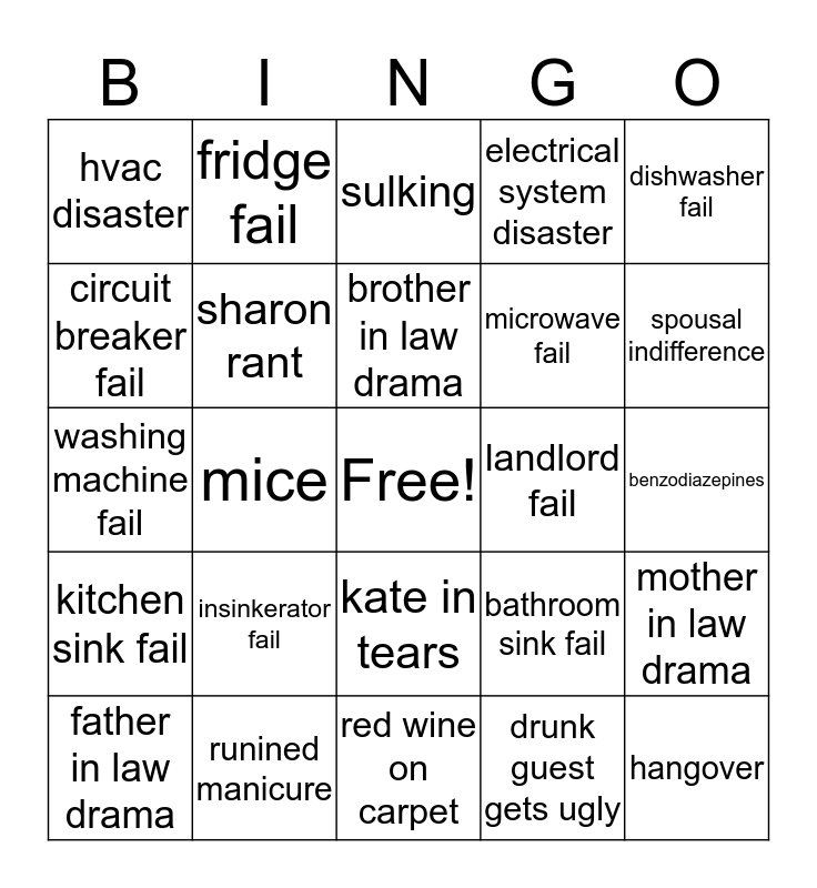 This bingo card has a free space and 30 words: runined manicure, dog shaming, mice, flu, hvac disaster, sulking, sharon rant, kate in tears, landlord fail, red wine on carpet, benzodiazepines, hangover, drunk guest gets ugly, passive-aggressive bullshit, spousal indifference, toilet fail, bathroom sink fail, kitchen sink fail, insinkerator fail, dishwasher fail, washing machine fail, dryer fail, fridge fail, microwave fail, circuit breaker fail, electrical system disaster, mother in law drama, father in law drama, brother in law drama and sister in law drama.