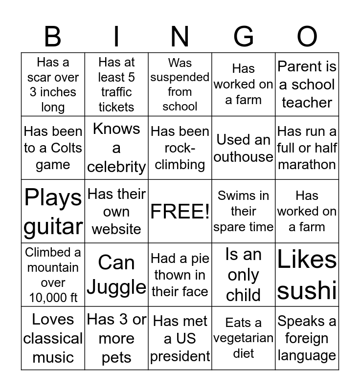 This bingo card has a free space and 24 words: Can Juggle, Has 3 or more pets, Has been rock- climbing, Loves classical music, Parent is a school teacher, Has a scar over 3 inches long, Has been to a Colts game, Has at least 5 traffic tickets, Swims in their spare time, Had a pie thown in their face, Used an outhouse, Plays guitar, Is an only child, Likes sushi, Knows a celebrity, Eats a vegetarian diet, Has worked on a farm, Was suspended from school, Has run a full or half marathon, Has their own website, Speaks a foreign language, Climbed a mountain over 10,000 ft, Has worked on a farm and Has met a US president.