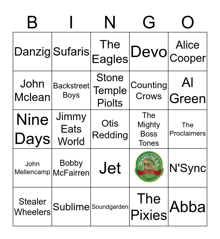 This bingo card has 1 images and 24 words: Bobby McFairren, Soundgarden, Stone Temple Piolts, Stealer Wheelers, Alice Cooper, Danzig, John Mclean, Sufaris, The Mighty Boss Tones, Jet, Counting Crows, Nine Days, N'Sync, Backstreet Boys, Abba, The Proclaimers, The Eagles, Al Green, Jimmy Eats World, Otis Redding, Sublime, John Mellencamp, Devo and The Pixies.