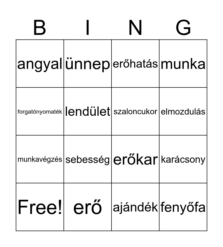 This bingo card has 17 words: Free!, erő, erőhatás, munka, munkavégzés, lendület, erőkar, elmozdulás, forgatónyomaték, sebesség, ajándék, karácsony, angyal, ünnep, szaloncukor, fenyőfa and csillagszóró.