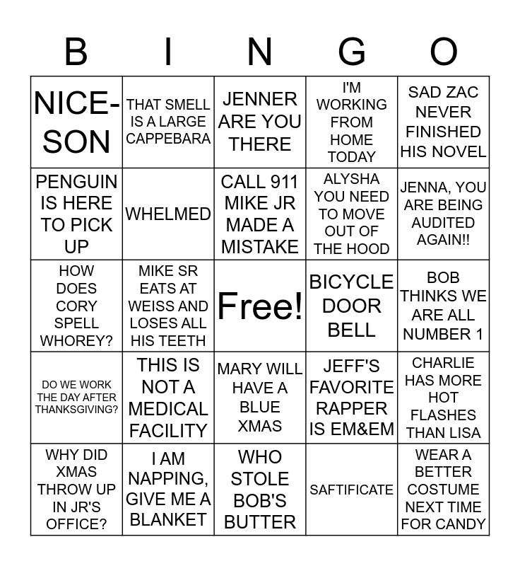 This bingo card has a free space and 24 words: THIS IS NOT A MEDICAL FACILITY, I AM NAPPING, GIVE ME A BLANKET, CALL 911 MIKE JR MADE A MISTAKE, WHY DID XMAS THROW UP IN JR'S OFFICE?, SAD ZAC NEVER FINISHED HIS NOVEL, NICE-SON, PENGUIN IS HERE TO PICK UP, THAT SMELL IS A LARGE CAPPEBARA, BICYCLE DOOR BELL, MARY WILL HAVE A BLUE XMAS, ALYSHA YOU NEED TO MOVE OUT OF THE HOOD, HOW DOES CORY SPELL WHOREY?, JEFF'S FAVORITE RAPPER IS EM&EM, CHARLIE HAS MORE HOT FLASHES THAN LISA, WHELMED, SAFTIFICATE, BOB THINKS WE ARE ALL NUMBER 1, JENNER ARE YOU THERE, JENNA, YOU ARE BEING AUDITED AGAIN!!, MIKE SR EATS AT WEISS AND LOSES ALL HIS TEETH, WEAR A BETTER COSTUME NEXT TIME FOR CANDY, DO WE WORK THE DAY AFTER THANKSGIVING?, I'M WORKING FROM HOME TODAY and WHO STOLE BOB'S BUTTER.