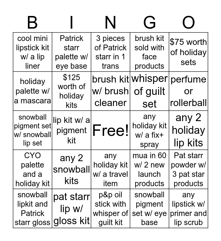 This bingo card has a free space and 24 words: any 2 snowball kits, pat starr lip w/ gloss kit, brush kit w/ brush cleaner, snowball lipkit and Patrick starr gloss, $75 worth of holiday sets, cool mini lipstick kit w/ a lip liner, holiday palette w/ a mascara, Patrick starr palette w/ eye base, any holiday kit w/ a fix+ spray, any holiday kit w/ a travel item, whisper of guilt set, snowball pigment set w/ snowball lip set, mua in 60 w/ 2 new launch products, Pat starr powder w/ 3 pat star products, $125 worth of holiday kits, snowball pigment set w/ eye base, any 2 holiday lip kits, 3 pieces of Patrick starr in 1 trans, perfume or rollerball, lip kit w/ a pigment kit, any lipstick w/ primer and lip scrub, CYO palette and a holiday kit, brush kit sold with face products and p&p oil stick with whisper of guilt kit.