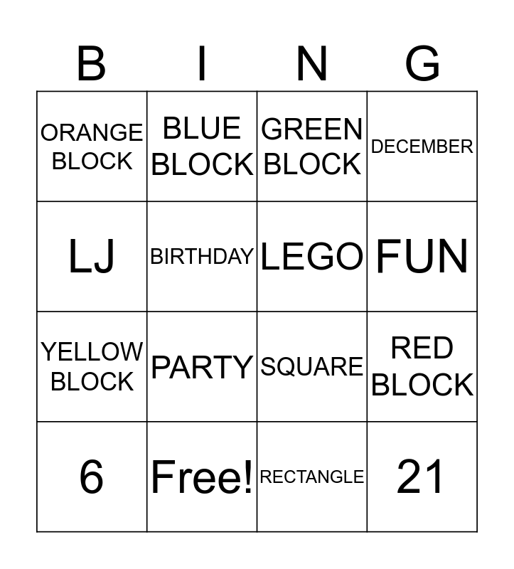 This bingo card has 16 words: Free!, RED BLOCK, GREEN BLOCK, ORANGE BLOCK, YELLOW BLOCK, BLUE BLOCK, SQUARE, RECTANGLE, LJ, BIRTHDAY, 6, DECEMBER, PARTY, FUN, LEGO and 21.