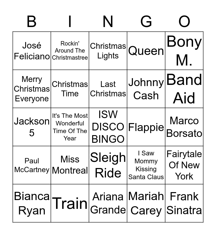This bingo card has a free space and 24 words: Miss Montreal, Train, Last Christmas, Bianca Ryan, Bony M., José Feliciano, Merry Christmas Everyone, Rockin' Around The Christmastree, Flappie, Sleigh Ride, Johnny Cash, Jackson 5, I Saw Mommy Kissing Santa Claus, Fairytale Of New York, Christmas Time, Mariah Carey, Marco Borsato, Christmas Lights, Band Aid, It's The Most Wonderful Time Of The Year, Frank Sinatra, Paul McCartney, Queen and Ariana Grande.