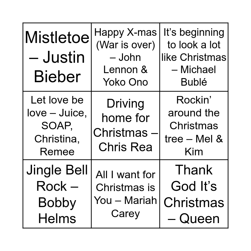 This bingo card has 26 words: Free!, Last Christmas – Wham, All I want for Christmas is You – Mariah Carey, Santa tell me – Ariana Grande, Driving home for Christmas – Chris Rea, Mistletoe – Justin Bieber, Rockin’ around the Christmas tree – Mel & Kim, Happy X-mas (War is over) – John Lennon & Yoko Ono, Jul-Det’Cool – Mc Einar, Jul i Angora – Drengene fra Angora, Thank God It’s Christmas – Queen, Underneeth the Mistletoe – Sia, Merry Xmas Everybody – Slade, Vil du være min I nat? – Caroline Henderson, 8 Days of Christmas – Destiny’s Child, I saw mommy kissing Santa Claus – The Jackson 5, Let love be love – Juice, SOAP, Christina, Remee, My only wish this year – Britney Spears, It’s beginning to look a lot like Christmas – Michael Bublé, Do they know it’s Christmas? – Band Aid, It’s hard to be a nissemand – De Nattergale, Guld Jul – Gulddreng, Feliz Navidad – José Feliciano, Merry Christmas Everyone – Shakin’ Stevens, Jingle Bell Rock – Bobby Helms and Tinka – Burhan G.