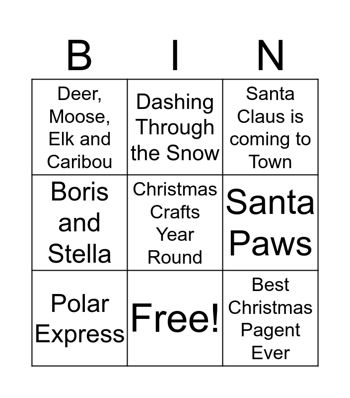 This bingo card has 15 words: Crafts for Christmas, Twas the night before Christmas, Santa Claus is coming to Town, Deer, Moose, Elk and Caribou, Free!, Christmas Crafts Year Round, Artic Tundra, the Santa Claus Book, Santa Paws, Best Christmas Pagent Ever, The Grouchy Santa, Boris and Stella, Polar Express, Dashing Through the Snow and Christmas in Austria.