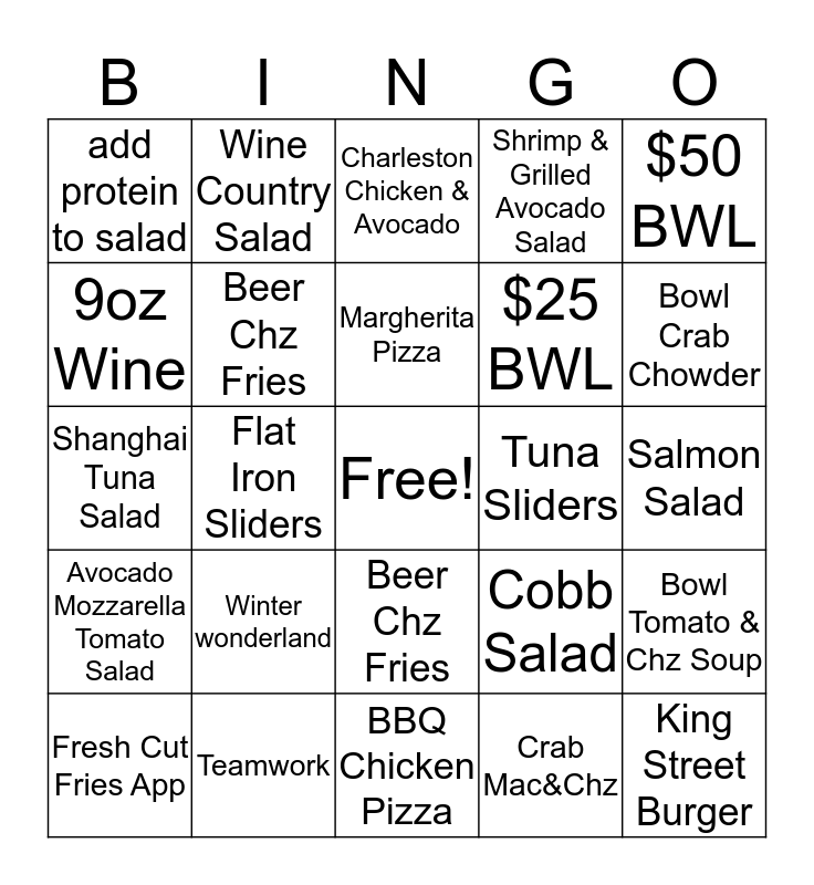 This bingo card has a free space and 24 words: Winter wonderland, Teamwork, Margherita Pizza, Fresh Cut Fries App, $50 BWL, add protein to salad, 9oz Wine, Wine Country Salad, Tuna Sliders, Beer Chz Fries, $25 BWL, Shanghai Tuna Salad, Cobb Salad, Bowl Tomato & Chz Soup, Beer Chz Fries, Crab Mac&Chz, Salmon Salad, Charleston Chicken & Avocado, Bowl Crab Chowder, Flat Iron Sliders, King Street Burger, Avocado Mozzarella Tomato Salad, Shrimp & Grilled Avocado Salad and BBQ Chicken Pizza.