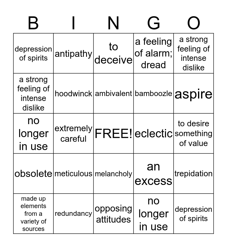 This bingo card has a free space and 24 words: meticulous, redundancy, ambivalent, made up elements from a variety of sources, a strong feeling of intense dislike, depression of spirits, a strong feeling of intense dislike, antipathy, eclectic, melancholy, bamboozle, no longer in use, an excess, trepidation, hoodwinck, no longer in use, to desire something of value, to deceive, aspire, extremely careful, depression of spirits, obsolete, a feeling of alarm; dread and opposing attitudes.