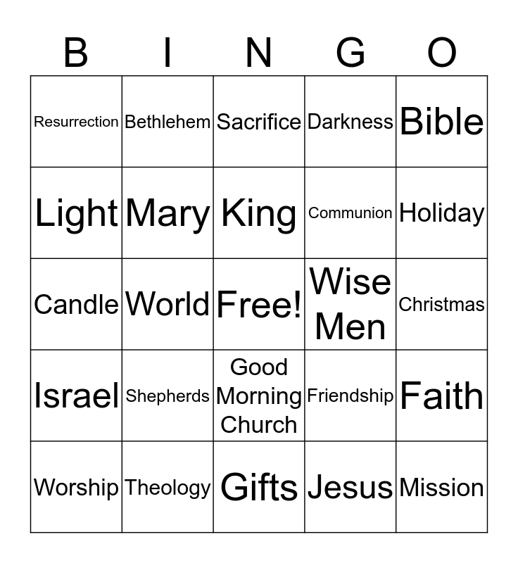 This bingo card has a free space and 26 words: Good Morning Church, Jesus, King, Theology, Bible, Resurrection, Light, Bethlehem, Christmas, Friendship, Communion, Candle, Faith, Worship, World, God, Darkness, Israel, Sacrifice, Mission, Holiday, Gifts, Wise Men, Shepherds, Mary and Joseph.