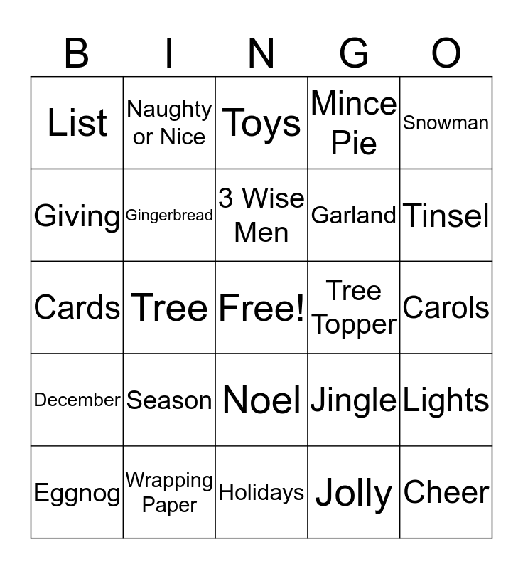 This bingo card has a free space and 34 words: Candle, Jolly, Holly, Merry, December, Gingerbread, Snowman, Eggnog, Naughty or Nice, Santa List, 3 Wise Men, Toys, Cider, Holidays, Tree Topper, Tinsel, Wrapping Paper, Cards, Season, Jingle, Noel, HOHOHO, List, Carols, Holidays, Cheer, Mince Pie, Deck the Halls, Garland, Giving, Christmas, Tree, Lights and Presents.