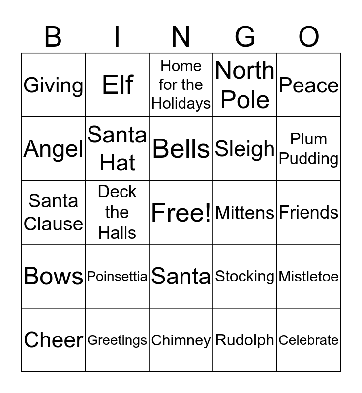 This bingo card has a free space and 29 words: Cheer, Mince Pie, Deck the Halls, Garland, Giving, Home for the Holidays, Santa Hat, Poinsettia, Mittens, Greetings, Friends, Celebrate, Chimney, Rudolph, Plum Pudding, Nativity, Santa, Bows, Peace, Santa Clause, Stocking, Fireplace, Sleigh, Angel, North Pole, Elf, Mistletoe, Bells and Wreath.