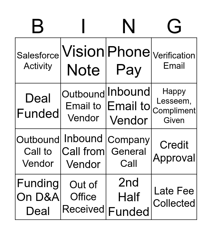 This bingo card has 19 words: Company General Call, Credit Application, Phone Pay, Late Fee Collected, Credit Approval, Deal Funded, 2nd Half Funded, Salesforce Activity, Vision Note, Outbound Call to Vendor, Inbound Call from Vendor, Outbound Email to Vendor, Inbound Email to Vendor, Out of Office Received, Funding On D&A Deal, Verification Call, Verification Email, Happy Lesseem, Compliment Given and Happy Vendor, Compliment Given.