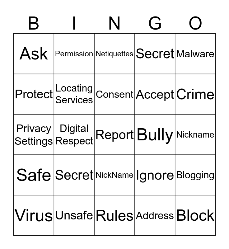 This bingo card has a free space and 24 words: Secret, Unsafe, Consent, Virus, Malware, Ask, Protect, Permission, Bully, NickName, Accept, Privacy Settings, Ignore, Blogging, Locating Services, Address, Nickname, Netiquettes, Crime, Digital Respect, Block, Safe, Secret and Rules.