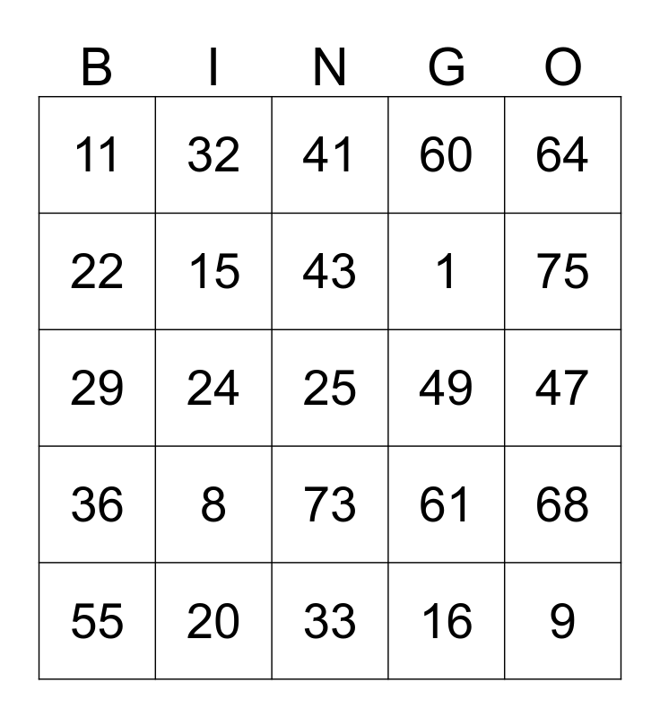 This bingo card has a free space and 24 words: 8, 20, 43, 55, 64, 11, 22, 32, 49, 73, 1, 29, 61, 68, 15, 16, 47, 41, 75, 24, 9, 36, 60 and 33.