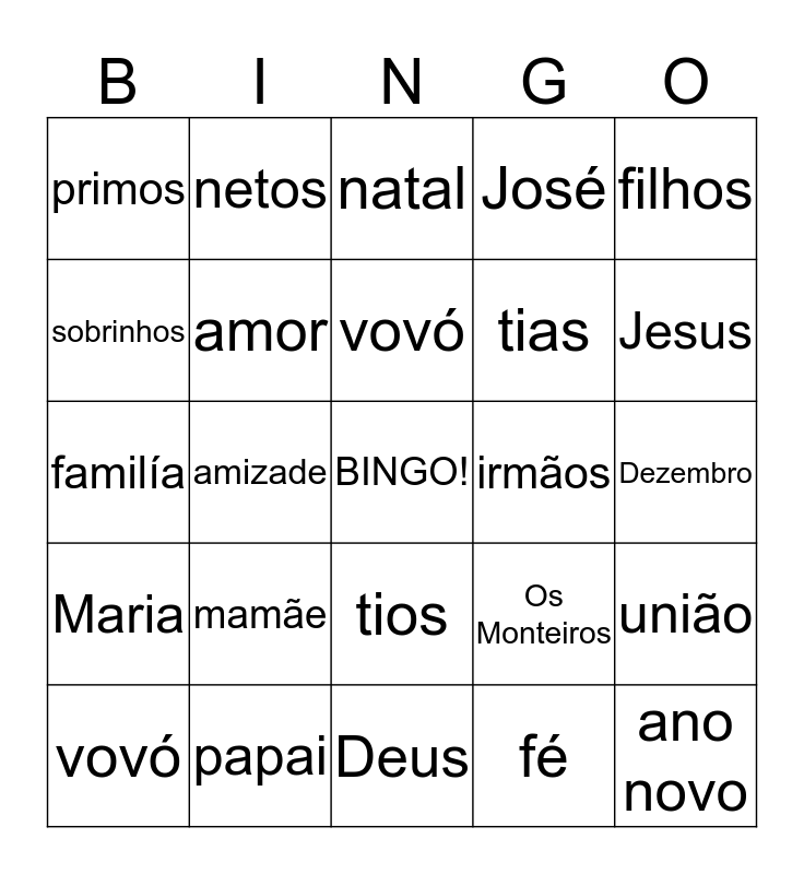 This bingo card has a free space and 24 words: mamãe, papai, vovó, vovó, filhos, primos, sobrinhos, netos, irmãos, tios, tias, familía, Os Monteiros, união, amor, fé, Dezembro, natal, Jesus, amizade, ano novo, Maria, José and Deus.