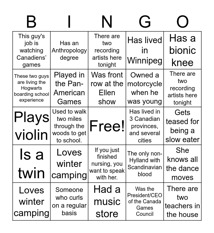 This bingo card has a free space and 34 words: Is the only person to have known Erik his whole life, Was the President/CEO of the Canada Games Council, Was drafted for the CFL, Has lost his passport twice in Europe, Is a twin, Played in the Pan-American Games, Has a bionic knee, Loves winter camping, Has an Anthropology degree, Has a successful food blog, Was front row at the Ellen show, There are two recording artists here tonight, Is technically homeless, Has met Orlando Bloom, Has lived in 3 Canadian provinces, and several cities, There are two recording artists here tonight, Someone who curls on a regular basis, Plays violin, Loves winter camping, The only non-Hylland with Scandinavian blood, If you just finished nursing, you want to speak with her., Owns a motorcycle, This guy's job is watching Canadiens’ games, Gets teased for being a slow eater, Had a music store, There are two teachers in the house, Has lived in Winnipeg, The Colton’s version of 5 star Janet, Owned a motorcycle when he was young, These two guys are living the Hogwarts boarding school experience, She is such a great dancer that she teaches it., Used to walk two miles through the woods to get to school., She knows all the dance moves and Worked in a fishing camp for several summers.